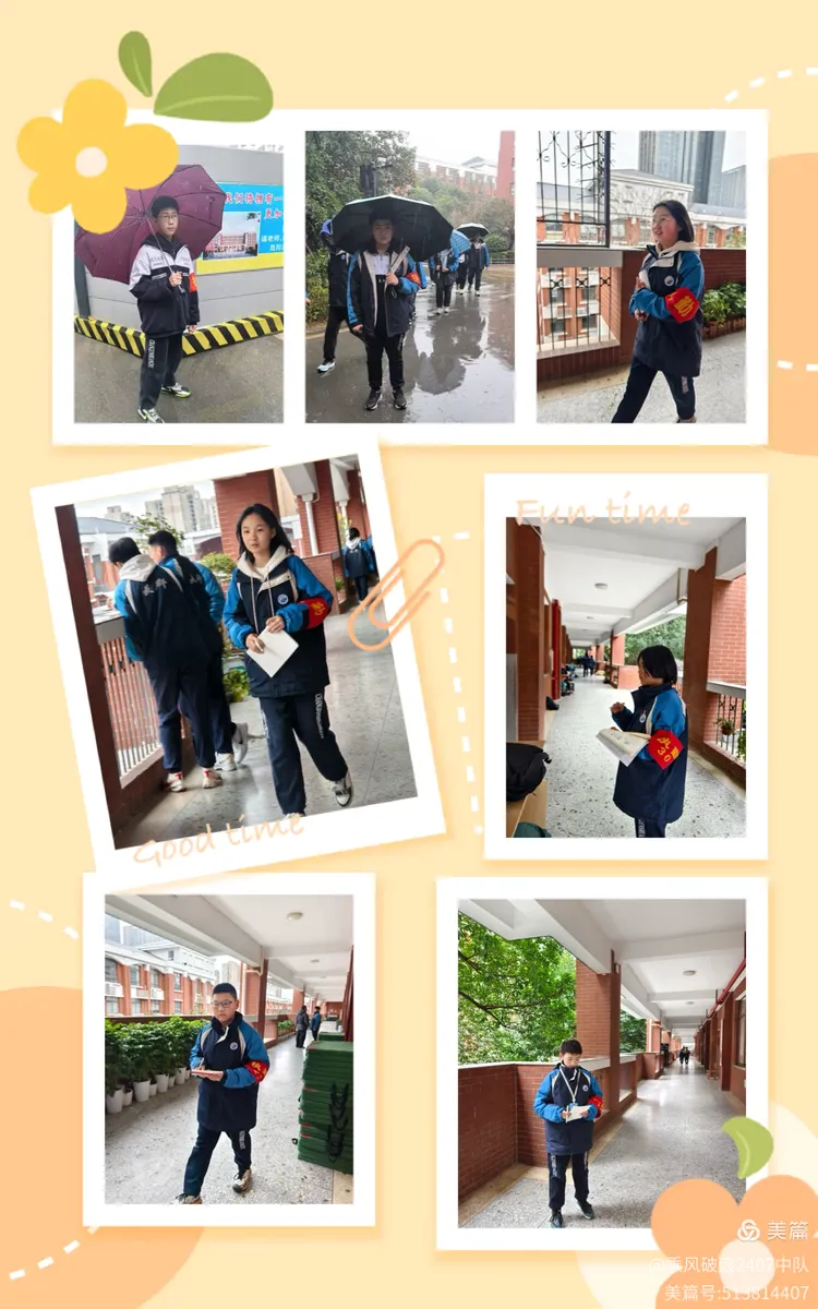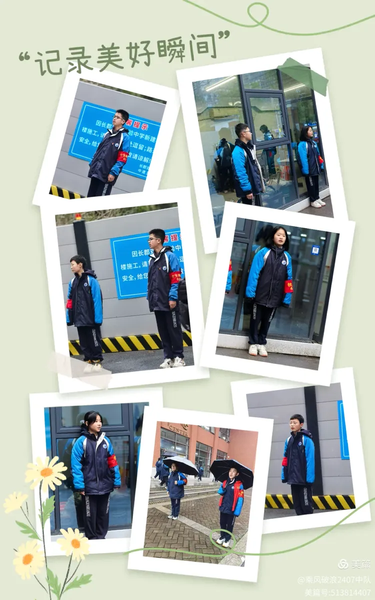 他们风雨无阻地穿梭在校园里,尽心尽责地做好每一件事,协助维持学校的正常秩序,规范学生的日常行为,默默地为学校贡献着自己的力量——这就是2407班执勤团队。